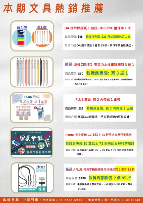 【敦煌中興】校內單位專屬優惠 · 熱銷文具推薦.畢業典禮加開營業!