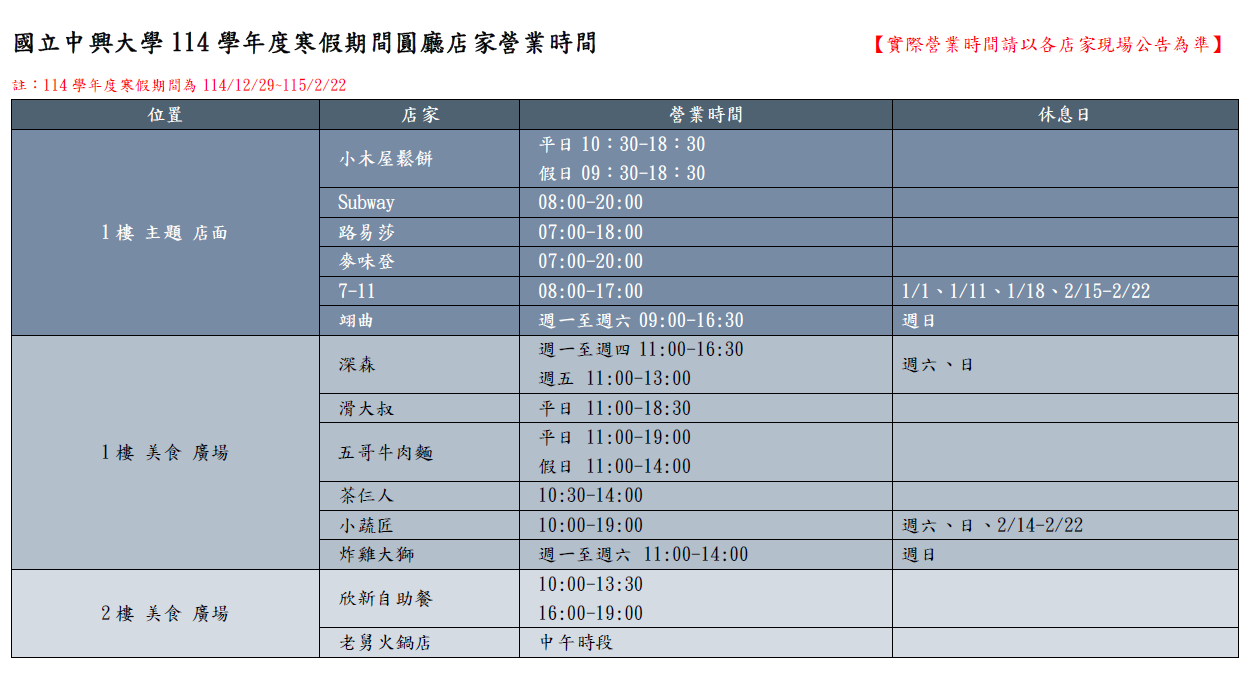 【圓廳】114學年度寒假期間圓廳店家營業時間