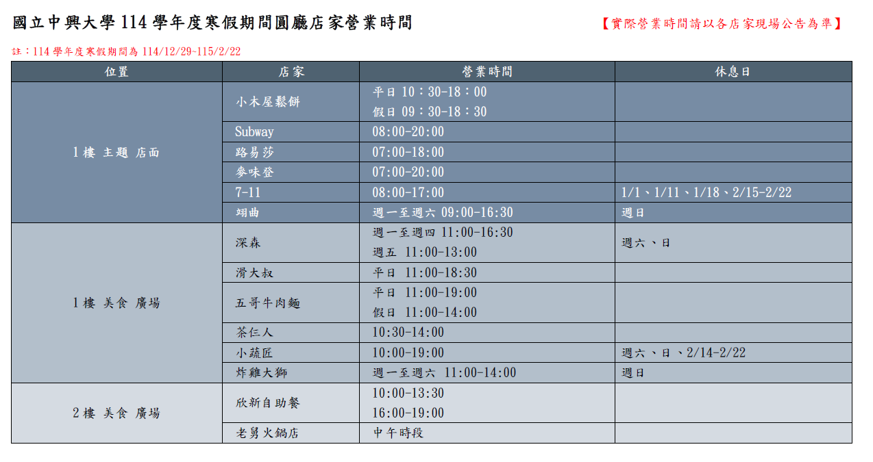 【圓廳】114學年度寒假期間圓廳店家營業時間