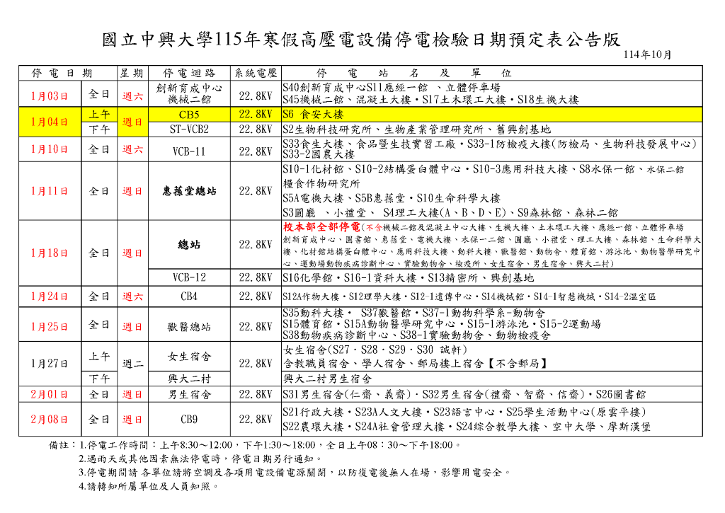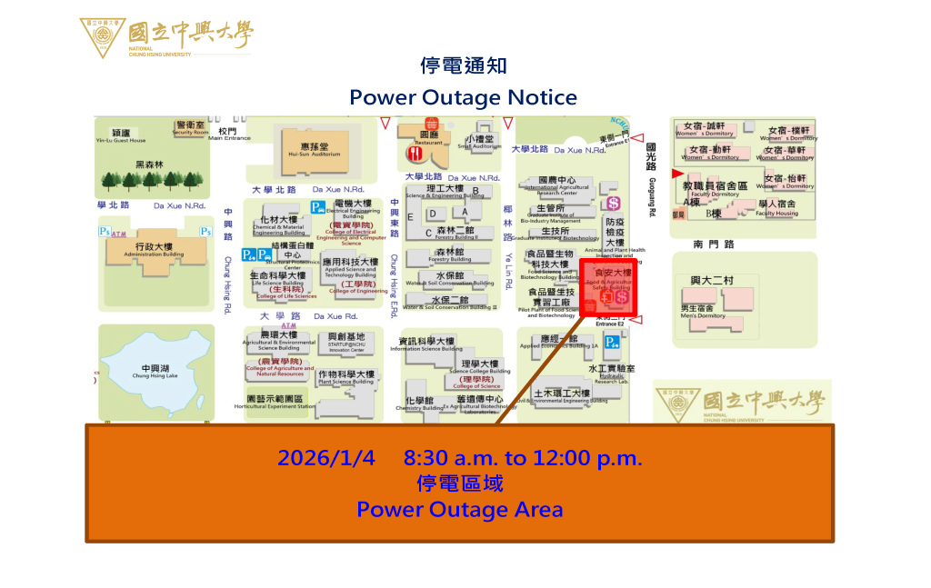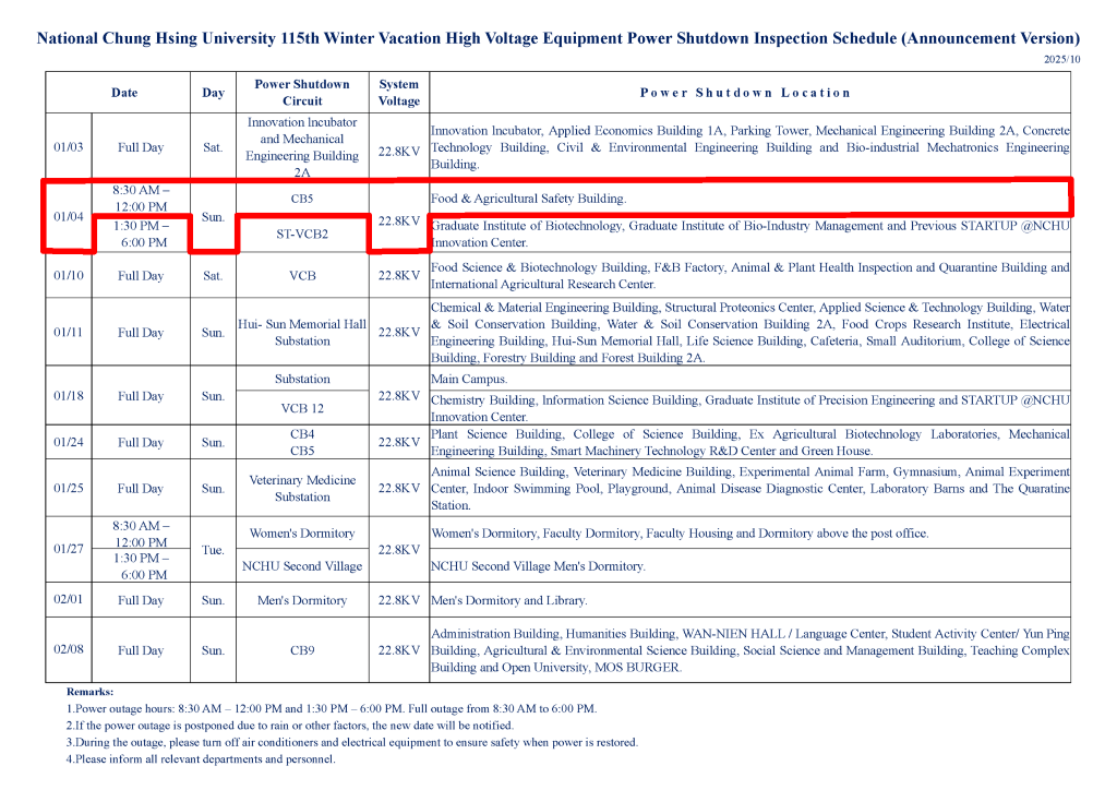 【停電公告-115年1月4日(日) [上午]-CB5迴路(食安大樓) 高壓設備停電檢驗通知】Power Outage Notice - 1/4/2026 (AM)