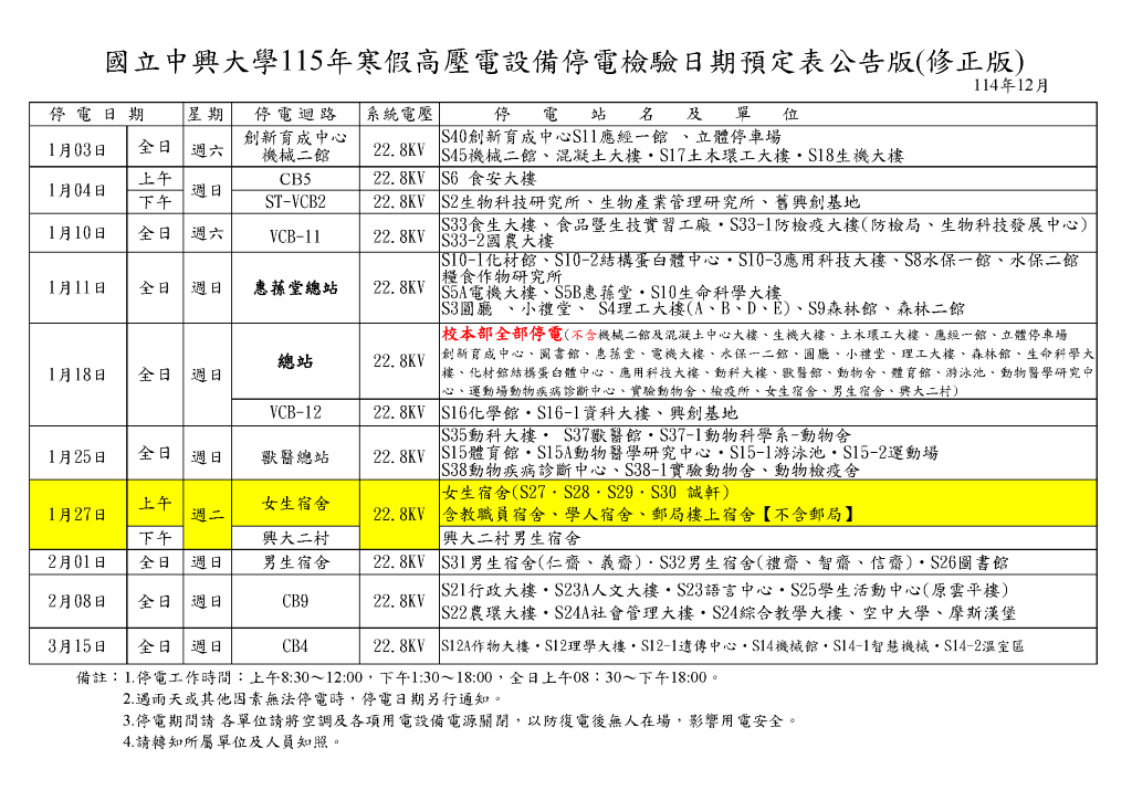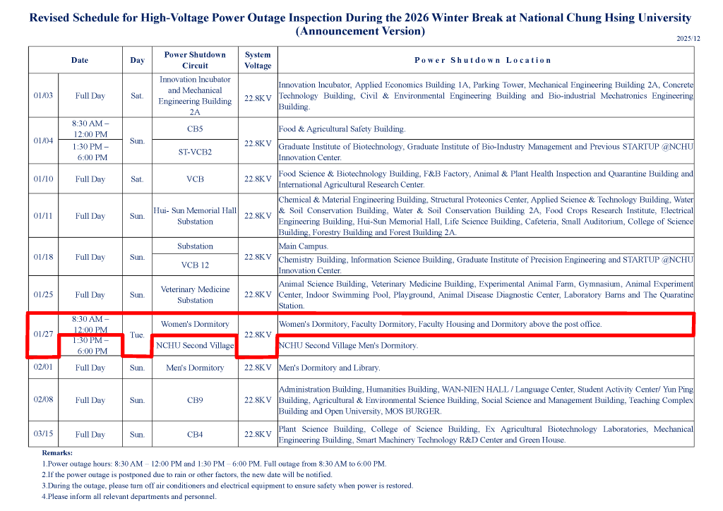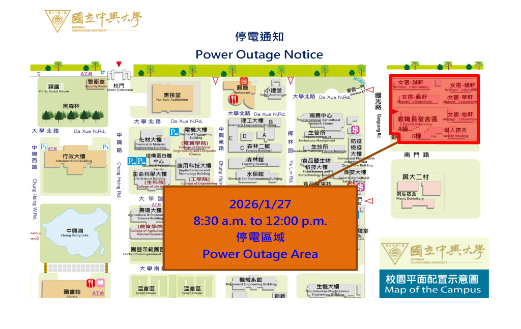【停電公告-115年1月27日(二) [上午]- 女生宿舍迴路(女生宿舍區、敎職員宿舍、學人宿舍區、郵局樓上宿舍) 高壓設備停電檢驗通知】Power Outage Notice 1/27, 2026 (Morning)