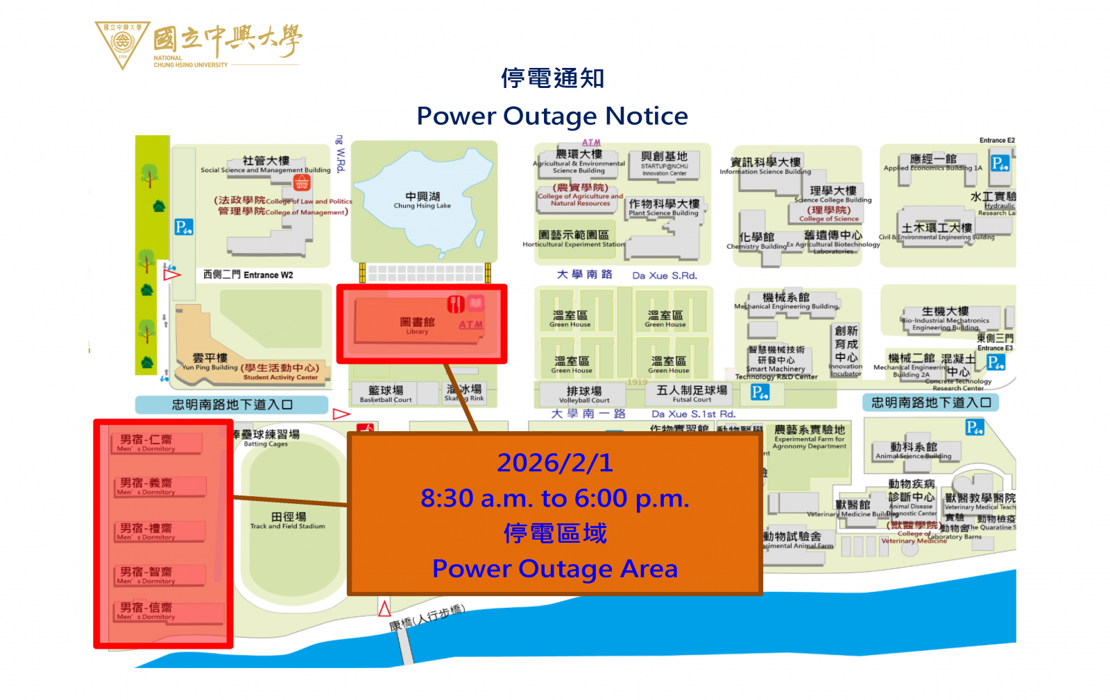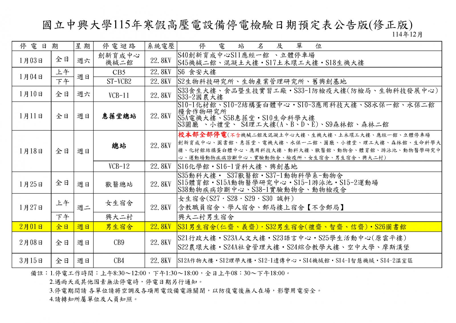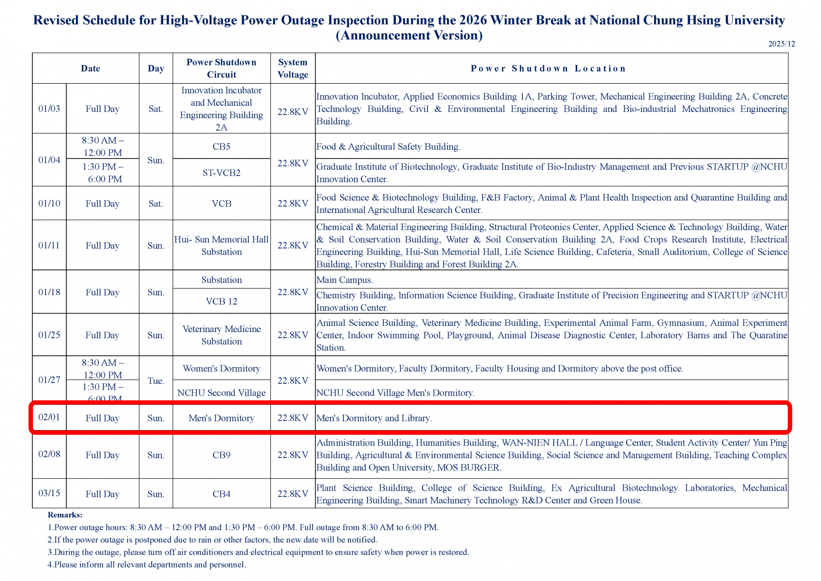 【停電公告-115年2月1日(日) 男生宿舍迴路 高壓設備停電檢驗通知】Power Outage Notice 2/1, 2026