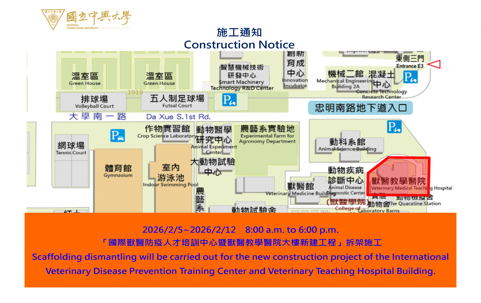 【施工公告-115年2月5日(四)至2月12日(四)「國際獸醫防疫人才培訓中心暨獸醫教學醫院大樓新建工程」拆架施工通知】Construction Notice 2/5 - 2/12, 2026