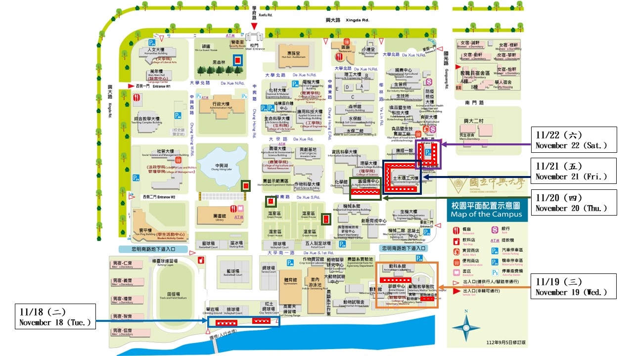 ※114年11月18日至11月22日(二~六):康堤、動科系館南側、獸醫學院、浪浪之家、舊遺傳中心、土木環工大樓、東二門立體停車場等周邊,進行枯樹移除與樹木修剪作業。