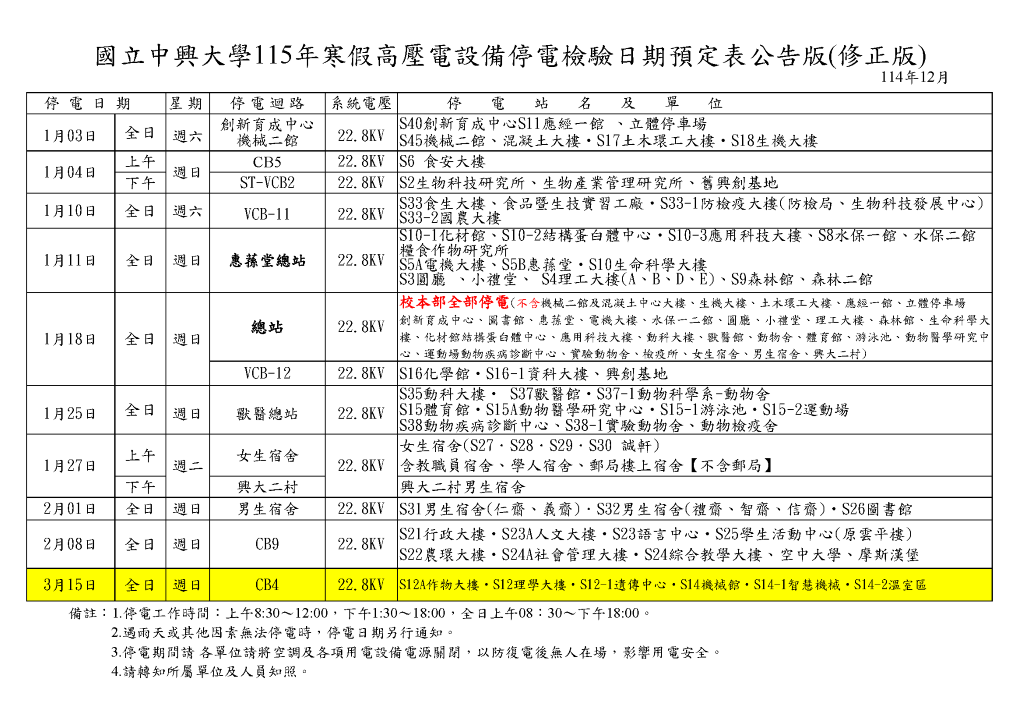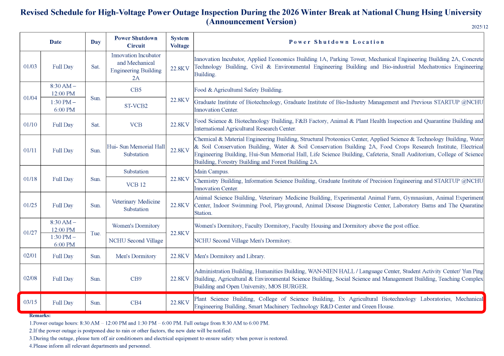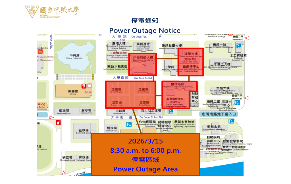 【停電公告-115年3月15日(日) CB4迴路(作物、理學大樓、遺傳中心、機械館、智慧機械及溫室區) 高壓設備停電檢驗通知】Power Outage Notice 3/15, 2026