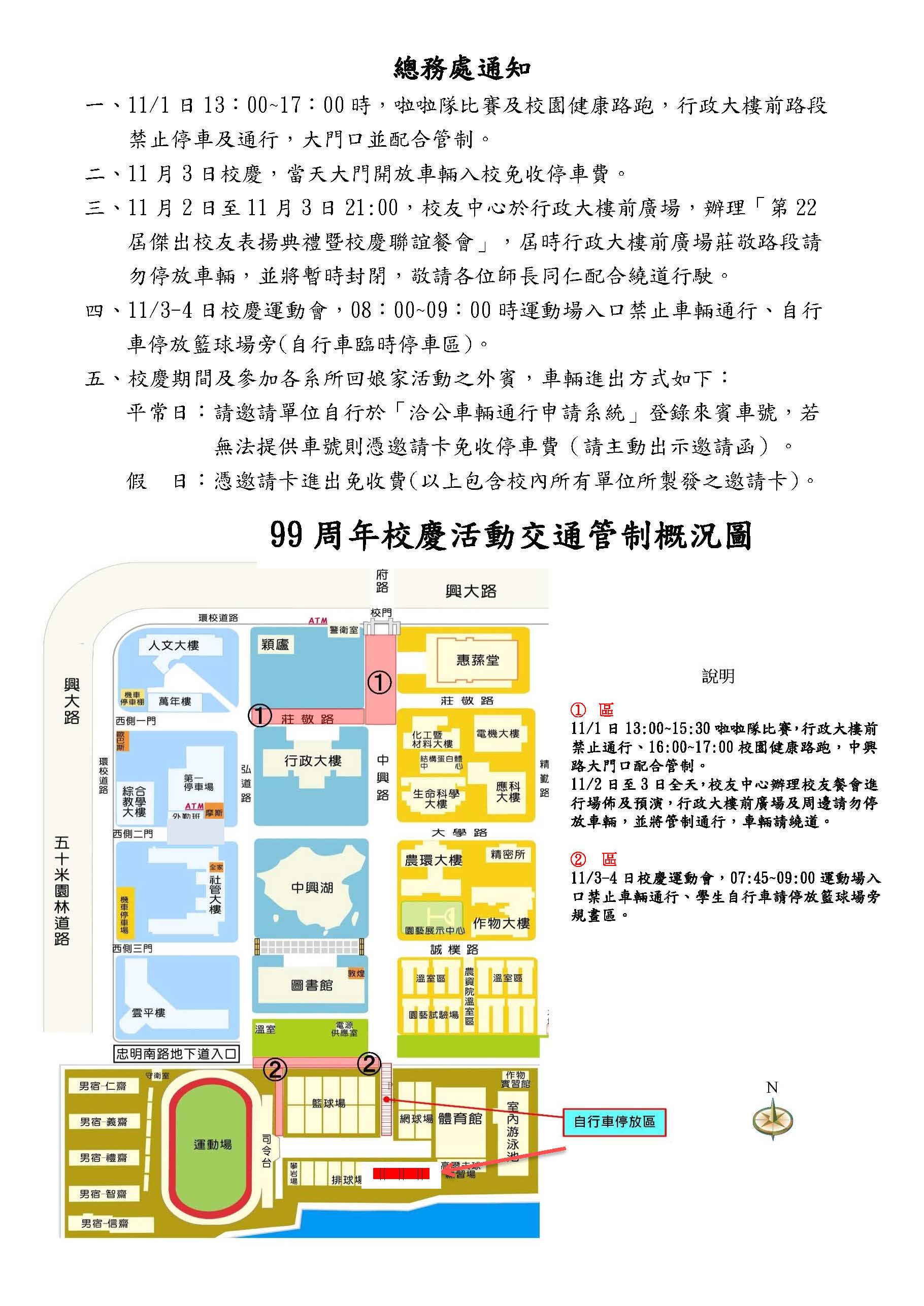 四、11/3-4日校慶運動會,08:00~09:00時運動場 入口禁止車輛通行、自行車停放籃球場旁(自行車臨時停車區)。